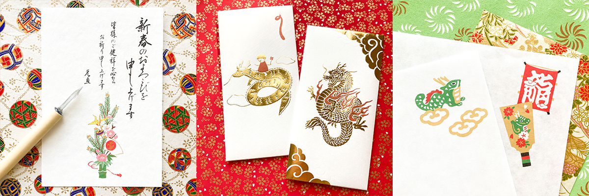 お正月には欠かせない年賀状やのし袋・ぽち袋などの製品や、ご自宅やお店を彩るお正月飾りなどをご紹介しています。